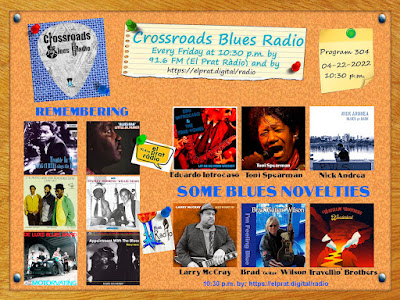 Program for April 22, 2022. First section “Remembering” with six artists: King Curtis, Little Jr. Parker, J.B. Hutto & The Houserockers, Stanley Behrens, De Luxe Blues Band, and Mary Lane, with songs recorded between 1962 and 1997. Next, in “Some Blues Novelties” we have three singles and three albums, with the latest recordings from: Eduardo Introcaso & The The True-Tones (Argentina), Toni Spearman (USA), Nick Andrea (USA), Larry McCray (USA), Brad “Guitar” Wilson (USA), and we finish with Travellin' Brothers (Spain).